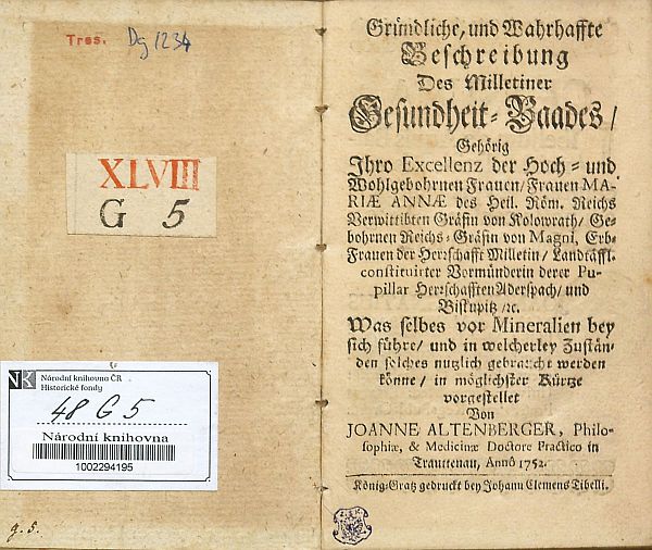 Gründliche, und Wahrhafte Beschreibung des Milletiner Gesundheit-Baades. Königgratz 1752.