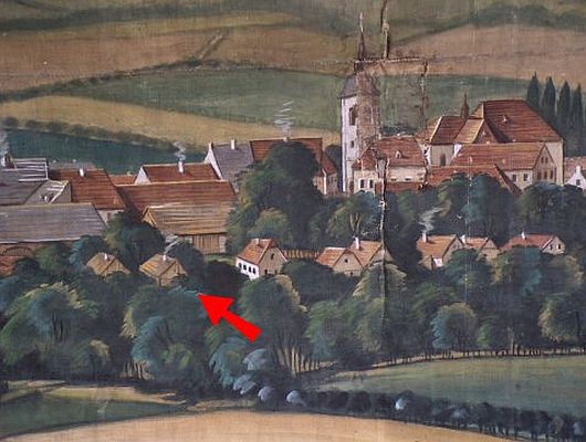 Po opravě. Před domem pózuje místní žebračka a posluhovačka Františka Koutová (SOkA Jičín).